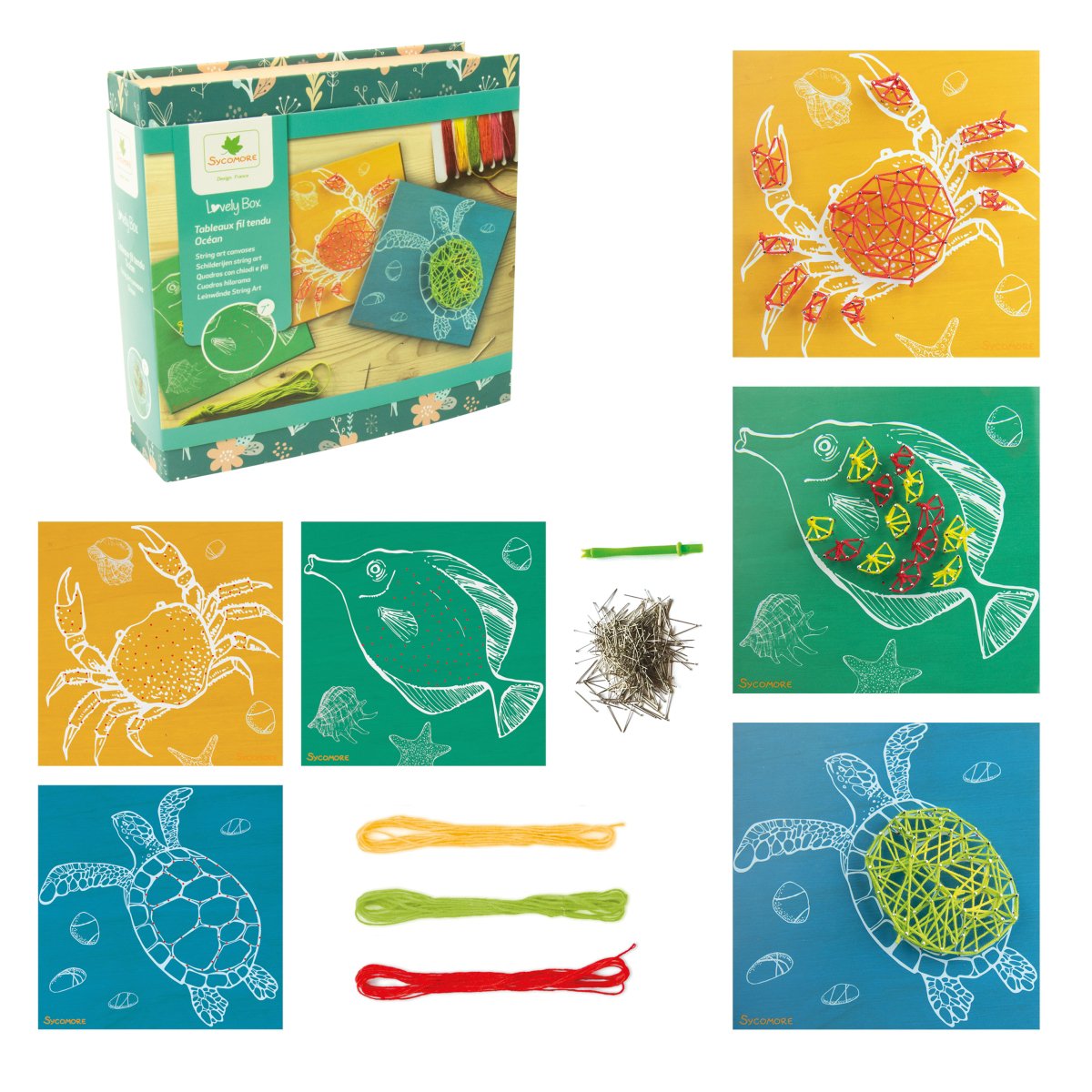 Γνωρίστε τον κόσμο του String Art με αυτό το σετ. Θα δημιουργήσετε 3 πίνακες με θέμα τα ζώα της θάλασσας. Φτιάξτε ένα ψαράκι, μια θαλάσσια χελώνα και ένα καβουράκι από τεντωμένα βαμβακερά νήματα.