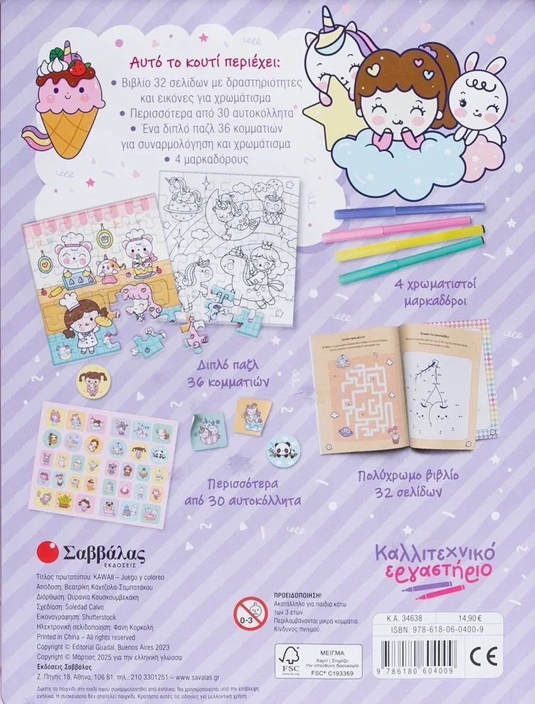 Καλώς ήρθες στον μαγικό κόσμο των KAWAII! Τα αξιολάτρευτα αυτά πλασματάκια σε προσκαλούν να κάνεις μια απολαυστική βουτιά σε μια σειρά ονειρεμένων και συναρπαστικών περιπετειών! Αυτό το κουτί περιέχει: • Βιβλίο 32 σελίδων με δραστηριότητες και εικόνες για χρωμάτισμα • Περισσότερα από 30 αυτοκόλλητα • Ένα διπλό παζλ 36 κομματιών για συναρμολόγηση και χρωμάτισμα • 4 μαρκαδόρους
