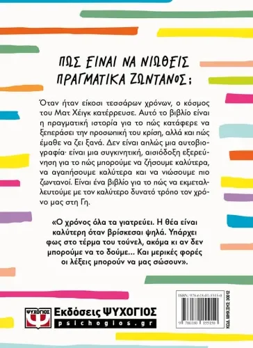 Όταν ήταν είκοσι τεσσάρων χρόνων, ο κόσμος του Ματ Χέιγκ κατέρρευσε. Αυτό το βιβλίο είναι η πραγματική ιστορία για το πώς κατάφερε να ξεπεράσει την προσωπική του κρίση, αλλά και πώς έμαθε να ζει ξανά. Δεν είναι απλώς μια αυτοβιογραφία· είναι μια συγκινητική, αισιόδοξη εξερεύνηση για το πώς μπορούμε να ζήσουμε καλύτερα, να αγαπήσουμε καλύτερα και να νιώσουμε πιο ζωντανοί. Είναι ένα βιβλίο για το πώς να εκμεταλλευτούμε με τον καλύτερο δυνατό τρόπο τον χρόνο μας στη Γη.