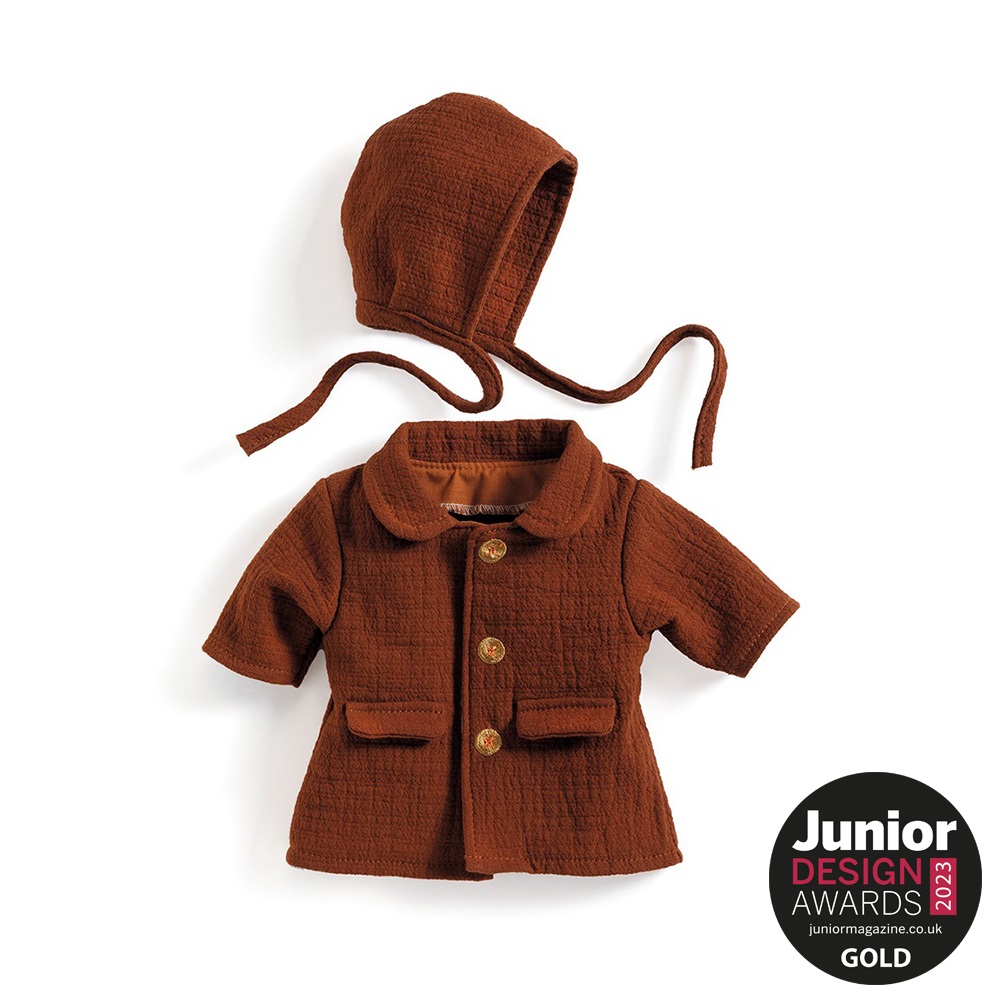 Σετ ντυσίματος κούκλας από τη σειρά Pomea της εταιρίας Djeco, που αποτελείται από ένα σκούφο και ένα παλτό που ανοιγοκλείνει με βέλκρο (velcro).