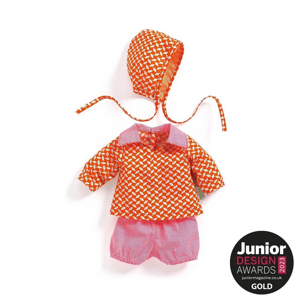 Σετ ντυσίματος κούκλας με μοντέρνο σχέδιο από τη σειρά Pomea της εταιρίας Djeco, που αποτελείται από σκούφο, μπλούζα που ανοιγοκλείνει με βέλκρο (velcro) και σορτς.
