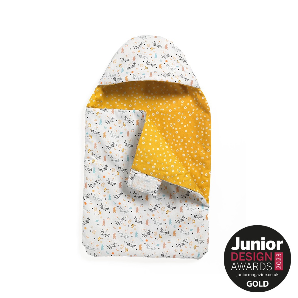 Υφασμάτινος υπνόσακος με κουκούλα από τη σειρά Pomea της εταιρίας Djeco, κατάλληλος για κούκλες και μωρά μεγέθους από 30 έως 34 εκατοστά.