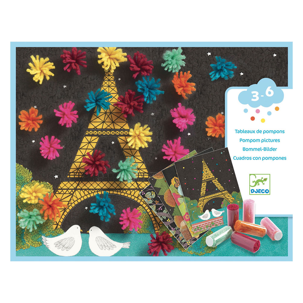 Με αυτό το κολλάζ της εταιρείας Djeco οι μικροί μας φίλοι μπορούν να διακοσμήσουν όμορφα εικόνες με τη χρήση πολύχρωμων πον – πον.