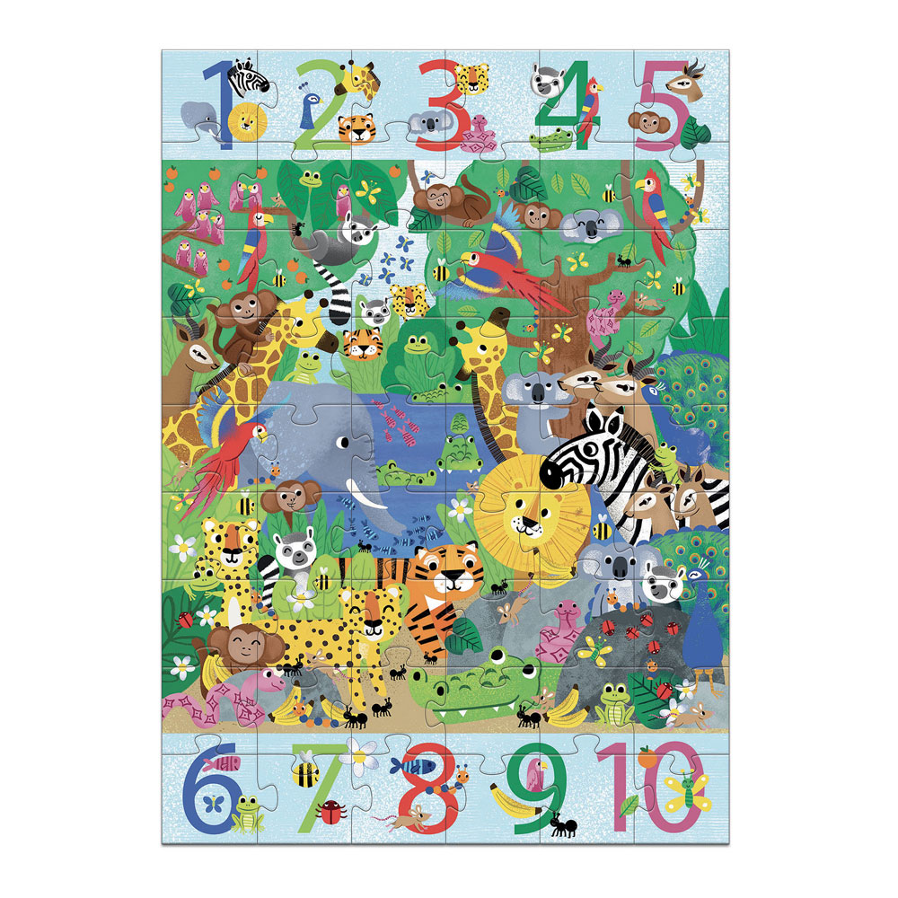 Στο επάνω και κάτω μέρος του υπάρχει σειρά με αριθμούς από 1 έως 10, που αποτελούν μικρές αριθμητικές προκλήσεις, στις οποίες καλείστε να ανακαλύψετε πόσες φορές εμφανίζονται τα ζωάκια μέσα στη ζούγκλα.