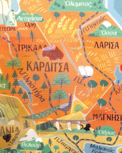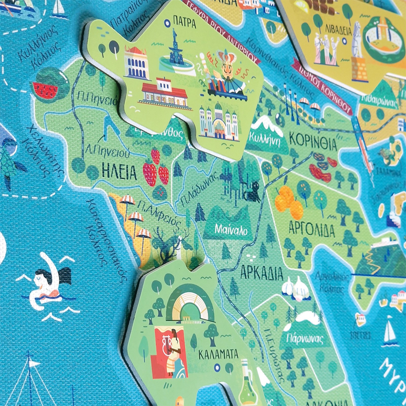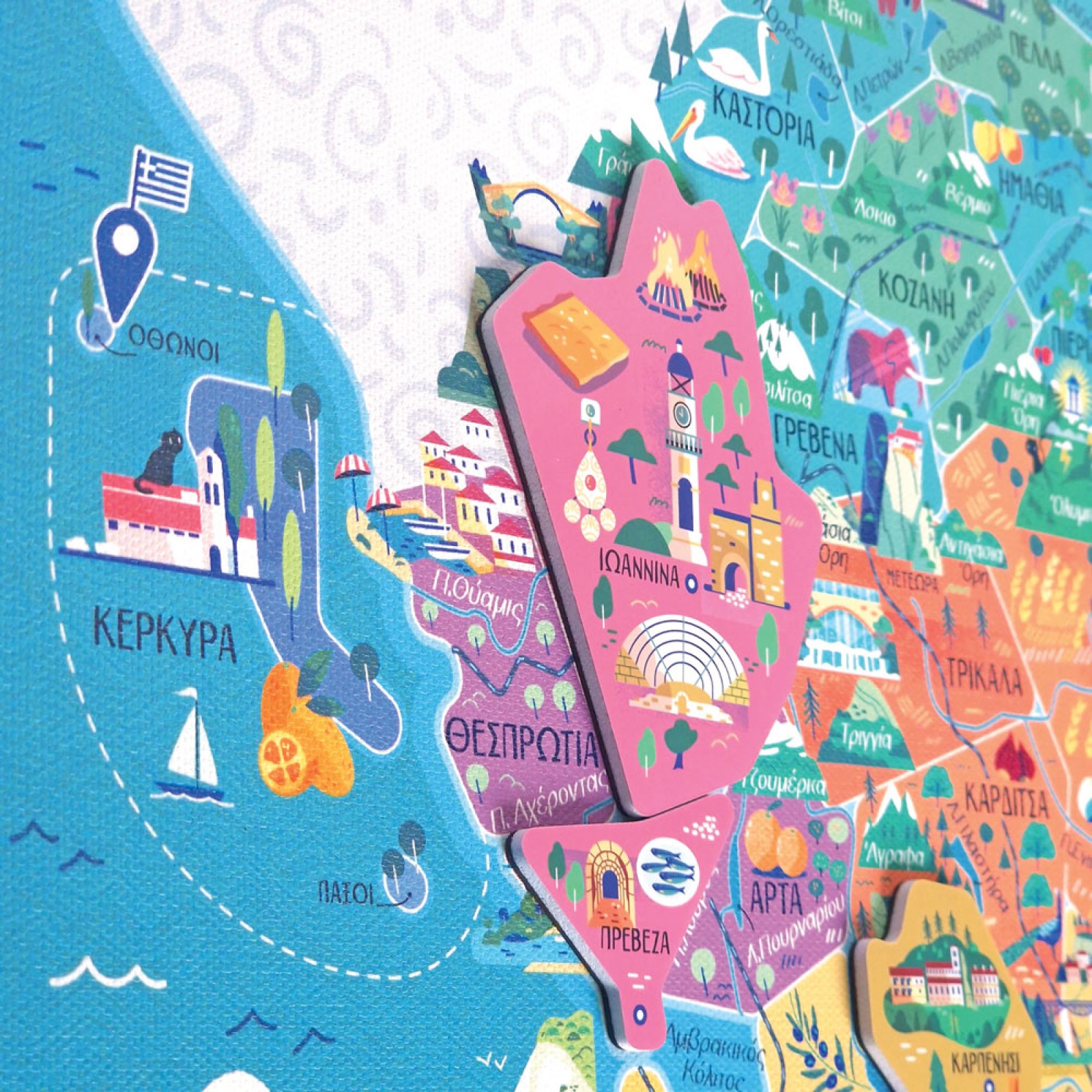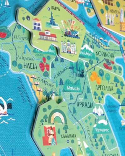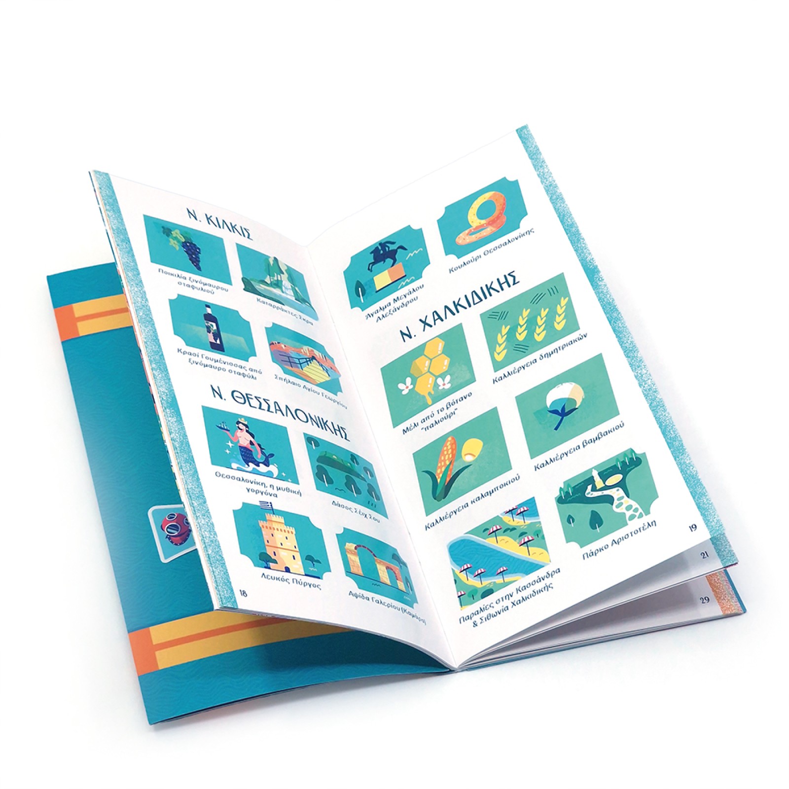 Με μια εντυπωσιακή εικονογράφηση γεμάτη γεωμορφολογικά στοιχεία – βουνά, ποτάμια, λίμνες – και μαγνητάκια που αναδεικνύουν τοπικά προϊόντα, αξιοθέατα και έθιμα, σας προσκαλεί να γνωρίσετε τη μοναδική γεωγραφία και πολιτιστική κληρονομιά της χώρας μας.